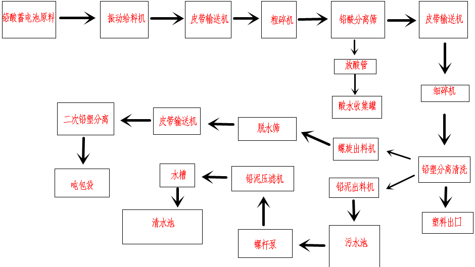鏟車將廢舊電瓶放入振動(dòng)給料倉,經(jīng)振動(dòng)料倉均勻進(jìn)入上料運(yùn)送機(jī),運(yùn)送機(jī)把電瓶送入雙刀粗碎機(jī),粗碎機(jī)通過雙刀將電瓶破碎至30mm左右寬度的條狀塊,落入下面的鉛酸振動(dòng)分離機(jī),電瓶里的酸會(huì)落入下層收集器,通過管道送入酸水收集罐集中處理,鉛和塑料通過上層篩網(wǎng)進(jìn)人二次細(xì)碎運(yùn)送機(jī),運(yùn)送機(jī)把鉛和塑料送入細(xì)碎機(jī),細(xì)碎機(jī)加水通過錘片對(duì)物料進(jìn)行細(xì)碎,加水的作用是利用細(xì)碎機(jī)錘頭,在轉(zhuǎn)動(dòng)破碎時(shí)更充分的對(duì)鉛塑清洗分離,達(dá)到粒度的鉛塑.通過細(xì)碎機(jī)篩孔隨水一塊進(jìn)入鉛塑分離機(jī),通過水的重力分選鉛和塑料,塑料漂浮在水面被撥輪撥到前面出塑口落下收集,鉛的比重大會(huì)沉入水底,經(jīng)螺旋出料機(jī)將鉛粒拉出送入滾筒脫水機(jī),鉛泥會(huì)落入前面的出水口進(jìn)入沉淀池,經(jīng)螺桿泵送入壓慮機(jī)進(jìn)行壓慮脫水,鉛泥會(huì)被壓慮機(jī)過濾,等待和鉛混合壓餅加工,水流入過濾水池,經(jīng)水泵再送入破碎機(jī)循環(huán)使用,脫水后的鉛里會(huì)含有比重大的塑紙和重塑,經(jīng)運(yùn)送機(jī)再送入負(fù)壓風(fēng)篩經(jīng)二次分離,塑料和塑紙會(huì)被風(fēng)抽走,比重大的鉛會(huì)落下來進(jìn)入收集器收集,破碎系統(tǒng)全程工作流程,無廢水流出污染環(huán)境,鉛會(huì)再次加工,塑料也會(huì)再次回收利用,采用水介質(zhì)分離避免了工人在生產(chǎn)過程中的鉛中毒,減輕了工人的勞動(dòng)強(qiáng)度。另一方面,把板柵材料和鉛泥分開,提高了爐料的鉛品位,從而減少了煙氣、棄渣和煙塵數(shù)量,減少能耗,提高金屬回收率、工效和產(chǎn)能,有利于環(huán)境保護(hù) 。