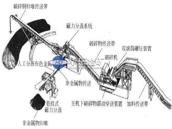 整條生產(chǎn)線由進(jìn)料輸送機(jī)、破碎機(jī)主機(jī)、出料輸送機(jī)、磁選輸送機(jī)、分料輸送機(jī)、除塵、操作柜組成。從金屬破碎機(jī)出來(lái)的破碎物,經(jīng)過(guò)皮帶輸送機(jī)、磁力分選系統(tǒng),把鐵金屬物和有色金屬物和非金屬物分離開(kāi),并由各自輸送機(jī)送出歸堆。有色金屬和非金屬物在輸送機(jī)上會(huì)再次受到磁選設(shè)備的搜索,把游離鐵金屬物揀出,從而提高鐵金屬物的回收率,同時(shí)通過(guò)人工挑選有色金屬,可提高回收效益。