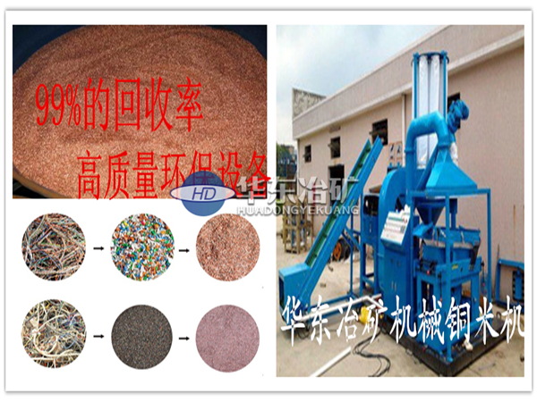 該型銅米機(jī)由粉碎機(jī)、輸送機(jī)、共振篩、離心風(fēng)機(jī)、除塵器幾部分組成。物料由進(jìn)料口進(jìn)入粉碎機(jī),粉碎后的物料由輸送機(jī)送到共振篩,在共振篩風(fēng)機(jī)的共同作用下銅和塑料分離開由兩端分別流出,灰塵雜質(zhì)由風(fēng)機(jī)送到除塵器中集中起來。